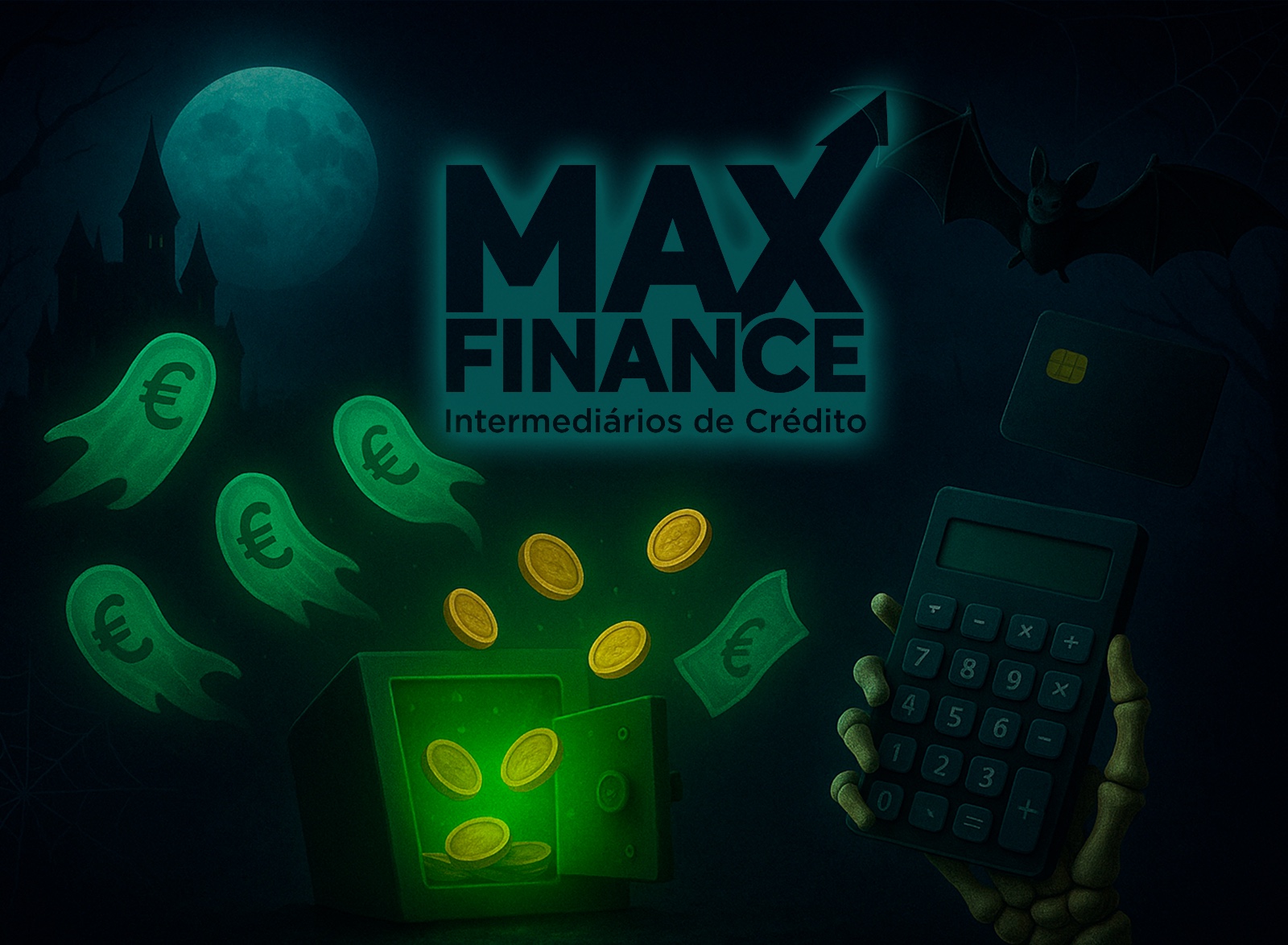 Ilustração temática de Halloween da MaxFinance, com o logótipo da empresa “MaxFinance — Intermediários de Crédito”. A imagem mostra notas em forma de fantasmas com símbolo do euro, moedas douradas a sair de um cofre, uma mão esquelética a segurar uma calculadora e um morcego a voar sob uma lua cheia, evocando humor e criatividade financeira.